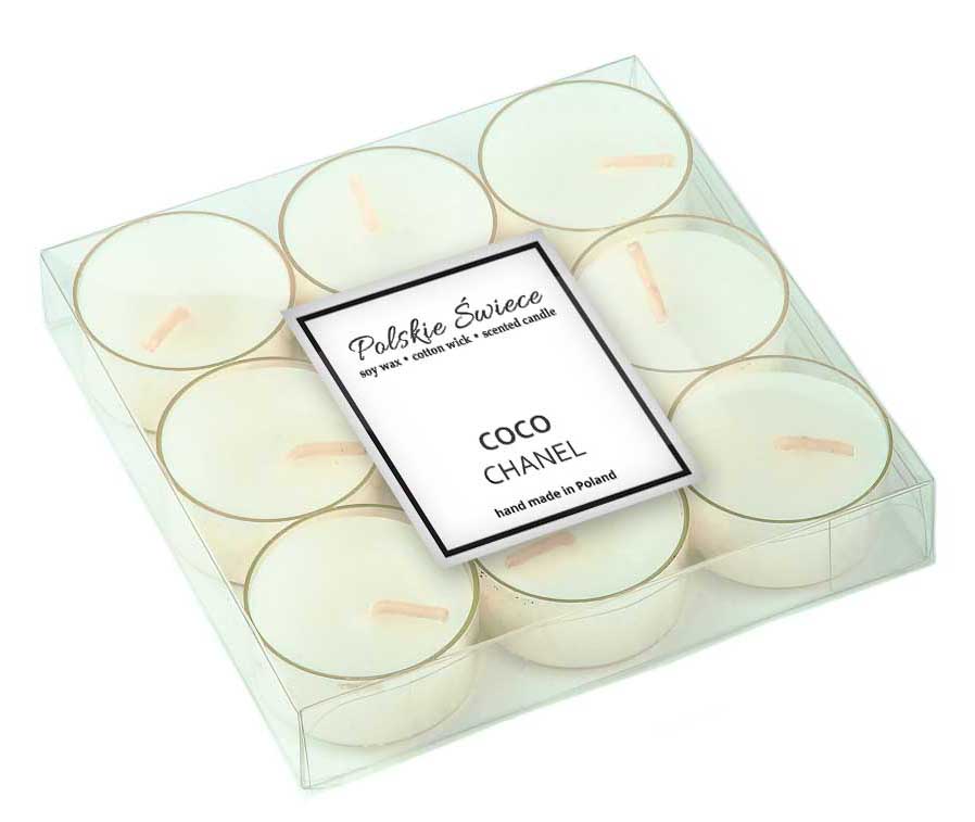 Podgrzewacze sojowe (tea-light) zapachowe. Seria scented w przeźroczystych naczyniach.
